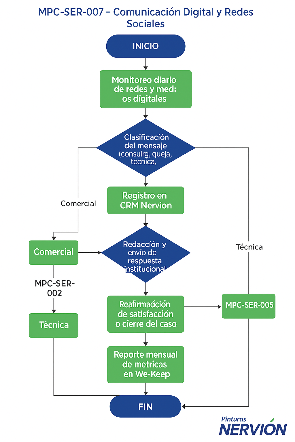 Establecer el procedimiento para la gestión, monitoreo y respuesta de comunicaciones digitales en las redes sociales y medios electrónicos de Pinturas Nervión, garantizando una atención oportuna, coherente con la identidad corporativa y alineada a los valores de la marca.